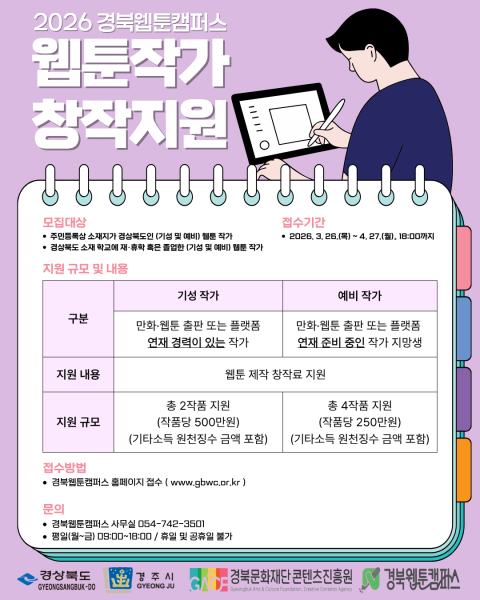 지역 콘텐츠 경쟁력 강화를 위해 <2026 경북웹툰캠퍼스 웹툰 창작 지원>을 아래와 같이 시행하오니